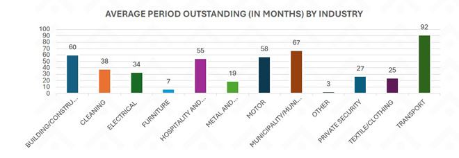 In terms of the periods over which contributions are in arrears, 43% are outstanding for up to 24 months (two years) – virtually unchanged from the end of 2023. In the local government sector, it is 67 months (almost six years), and the average across all sectors is 48 months (four years).
