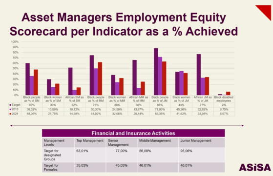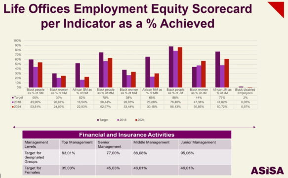 Employment equity also remains uneven. Life offices improved across all levels, with only black individuals and black women in junior management meeting targets. Asset managers advanced at senior and middle levels but declined at junior levels.