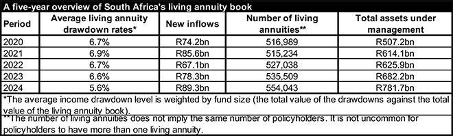 The living annuity asset pool grew to R781.7 billion by the end of December 2024, compared with R682.2bn at the end of 2023; an increase of 14.6%. The number of living annuities increased from 535 509 at the end of 2023 to 554 043 as of 31 December 2024.