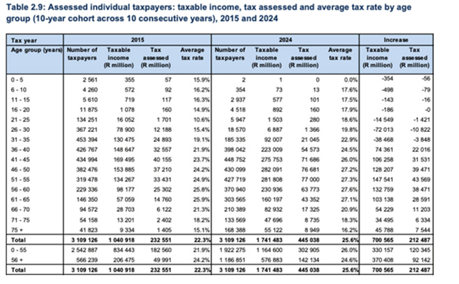 By contrast, fewer than 20% of registered taxpayers earned more than R500 000, yet they were liable for 77% of total tax assessed. Taxpayers aged between 41 and 65 contributed almost 75% of the total tax assessed.