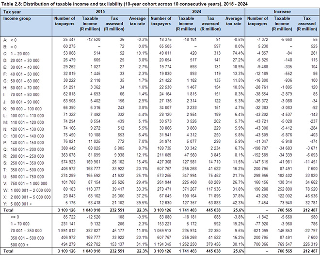 For the 2024 tax year, 80.4% of assessed individual taxpayers had taxable income of less than R500 000. While they earned just over 44% of total taxable income, they contributed only 23% of the tax assessed.
