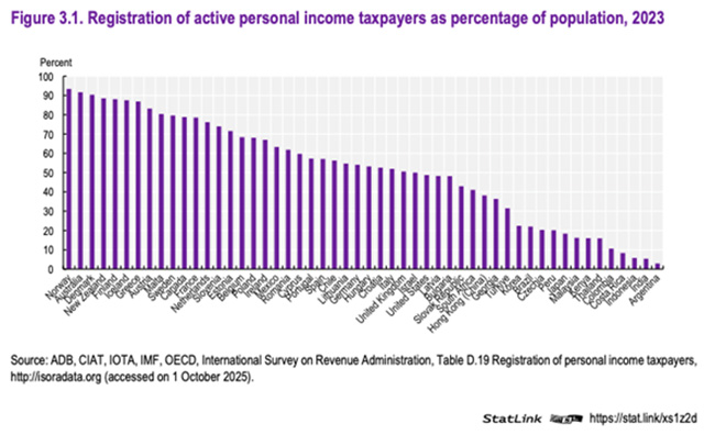 The following graph from the Tax Administration 2025: Comparative Information on OECD and Other Advanced and Emerging Economies report illustrates how South Africa compares with other jurisdictions in terms of active taxpayer registrations.