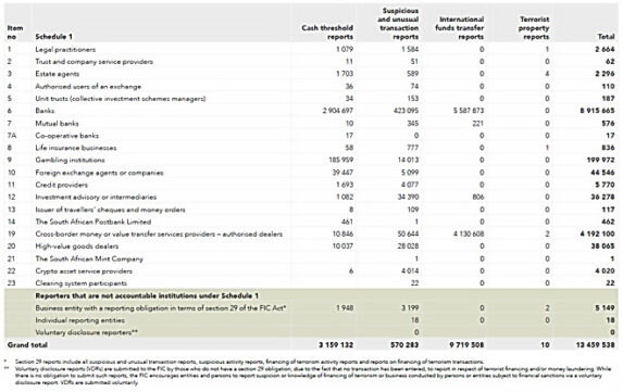 To that end, the 55 262 institutions registered with the FIC submitted more than 13.4 million regulatory reports during the 2024/25 financial year. These include more than 3.1 million cash threshold reports and more than 570 000 suspicious and unusual transaction reports.