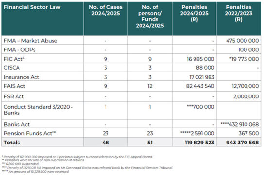 One of the significant penalties during the reporting period was the R68m fine imposed on the key individuals of the N-e-FG group of companies: Phahamisa Administrators (Pty) Ltd (formerly N-e-FG Administrators), N-e-FG Fund Management (Pty) Ltd, and The Wealth Strategist (Pty) Ltd.