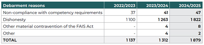 FSPs debarred 1 679 representatives during the reporting period, which was from 1 April 2024 to 31 March 2025. The FSCA said the upward trend “underscores the growing vigilance among FSPs in maintaining ethical standards and regulatory compliance within the financial services industry”.