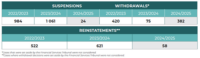 The number of FSP licence suspensions decreased by 98%, from 1 061 in 2023/24 to only 24 in 2024/25. Conversely, licence withdrawals increased by 409%, from 75 in 2023/24 to 382 in 2024/25.