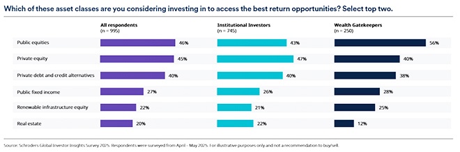 The survey’s findings show that equities are the most popular asset class for generating returns, despite recent market turbulence. Nearly half of the respondents (46%) chose public equities as their top choice, closely followed by private equity at 45%. Schroders said this trend reflects a renewed focus on agility and diversification.