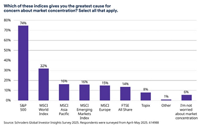 Robotham said concerns about index concentration – particularly in the US – are driving this trend. Only 5.5% of investors said they were not concerned about market concentration. Most cited the heavy weighting of large-cap US tech stocks in global indices as a key risk.