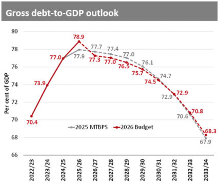 Those figures appear daunting, but sustainability is measured less by nominal debt than by debt relative to economic output. On that metric, the ratio is projected to stabilise at 78.9% of GDP in 2025/26 and decline to 76.5% by 2028/29.