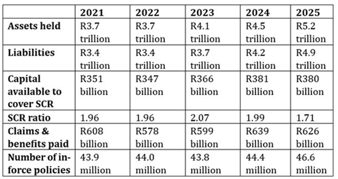 The data shows a steady expansion of the life insurance sector over the five-year period, with assets under management rising from R3.7 trillion in 2021 to R5.2 trillion in 2025, alongside a corresponding increase in liabilities from R3.4 trillion to R4.9 trillion.
