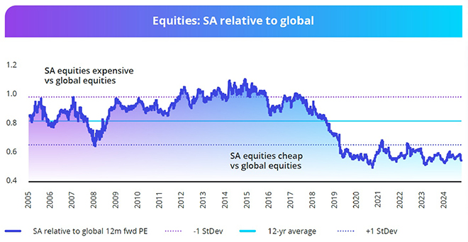 Despite strong performance in 2025 – with the FTSE/JSE All Share Index returning 22% excluding resource stocks – South African equities continue to trade below their 12-year forward price-to-earnings average and at a meaningful discount to global markets.