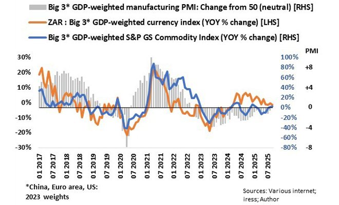 The outlook for commodities, and therefore the world rand, is highly dependent on how the manufacturing sector PMI in the Big Three evolves over the next few quarters. The outlook is not great, though, as investment banks are forecasting slower economic growth over the next two to three quarters, implying that the global manufacturing sector may remain in contraction mode despite easing monetary policies.