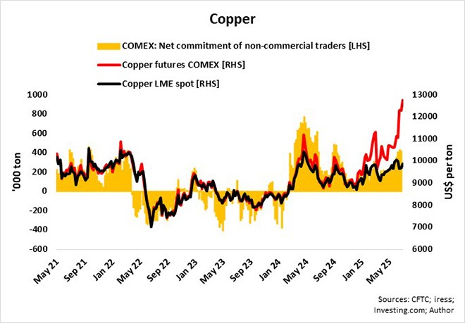 In my opinion, the fundamentals of the global copper market are likely to change considerably after 1 August, when the 50% tariff becomes effective. US copper imports are likely to drop significantly due to tepid demand, while copper exporters from other countries will have to try to find other markets for their products. Copper stockpiles in LME and Shanghai Futures Exchange warehouses are likely to expand again, which normally results in downside pressure on copper prices, exacerbated by the possible liquidation of non-commercial long positions on COMEX.