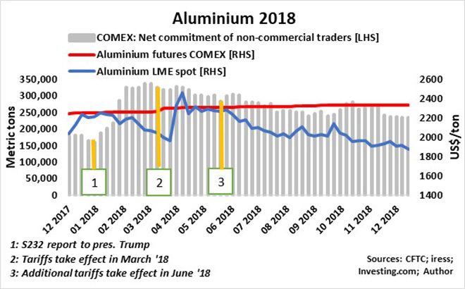 In January 2018, Trump received a Section 232 report on aluminium and steel imports, citing national security concerns. In March, Trump imposed tariffs on steel and aluminium and imposed additional tariffs in June that year. After the additional tariffs took effect in June, the COMEX aluminium futures price remained steady through to the end of 2018. The spot aluminium price on the LME immediately after the tariff hike in June commenced a gradual decline through end-2018, resulting in the COMEX premium increasing to about 25%, while non-commercial traders (speculators and financial institutions) cut their net long positions by more than 20% over the same period.
