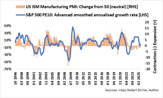 My advanced smoothed annualised growth rate of the S&P 500 PE10 ratio has been a reliable leading indicator of the US’s manufacturing sector over the past 30 years. It tends to lead the manufacturing cycle, measured by the ISM Purchasing Managers Index (PMI) by two to three quarters. (This cyclically adjusted price-to-earnings ratio uses average earnings over the past 10 years and smooths out the impact of business cycles.)