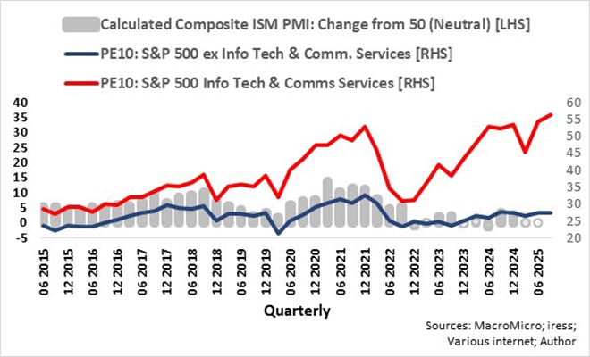 It appears that the S&P PE10’s smoothed annualised rate since 2023 was mostly driven by the information technology and communications services sectors combined because the other components of the S&P 500 merely reflected the improved conditions in the services sector of the economy, with the composite ISM PMI (calculated in the ratio of 20% manufacturing and 80% services) recovering modestly in 2024.