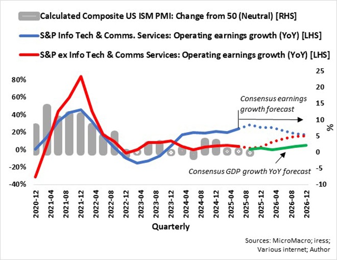 It seems that consensus (from various sources) bottom-up operating earnings growth forecasts for S&P 500 companies, excluding information technology and communications services, are overly optimistic given GDP forecasts through end-2026 because earnings growth could pan out more than 5% lower than currently forecast.