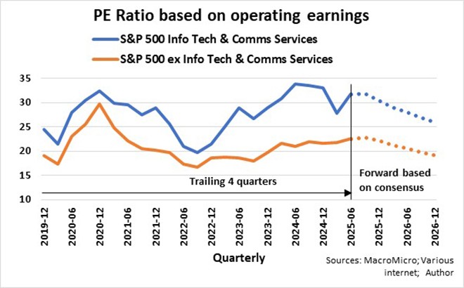 The four quarters’ forward PE ratio based on operating earnings for the combined S&P 500 information technology and communications services sectors, according to analysts’ forecasts, is currently at about 27, while the forward PE of the other sectors of the S&P 500 combined is about 20. However, downside earnings surprises could result in forward PEs of 30 and 22-plus, respectively.