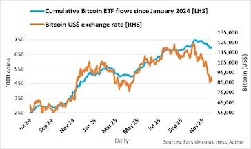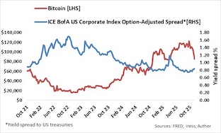 The stock price and bonds of a geared hyperscaler such as Oracle, whose bond yield spread to US 20-year treasuries increased to 170 basis points from 100 in mid-September, are under immense pressure as they negotiate financing with banks and other financial institutions. Bitcoin, on the other hand, has tested the April 2025 lows.