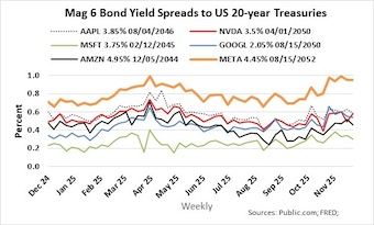 The big question is how high the average yield spread of the Magnificent Six will go. The massive spending and the financing thereof by the hyperscalers (companies that provide massive, on-demand cloud computing resources through large-scale data centre that can rapidly scale up or down to meet fluctuating demands) have been telegraphed to investors for months and are probably priced into hyperscalers’ debt instruments and therefore in the yield spreads. Furthermore, the average yield spread of the Magnificent Six is currently within reach of the April 2025 highs.