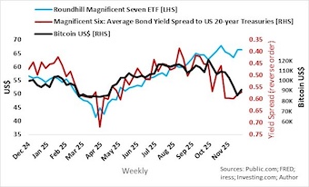 It also appears that investors are hedging total exposures (equity and debt) to the Magnificent Seven stocks (with Roundhill Magnificent Seven ETF offering equal weight exposure to the Magnificent Seven as a proxy) by demanding higher credit spreads, Bitcoin sales, and equity rotation among the AI players.